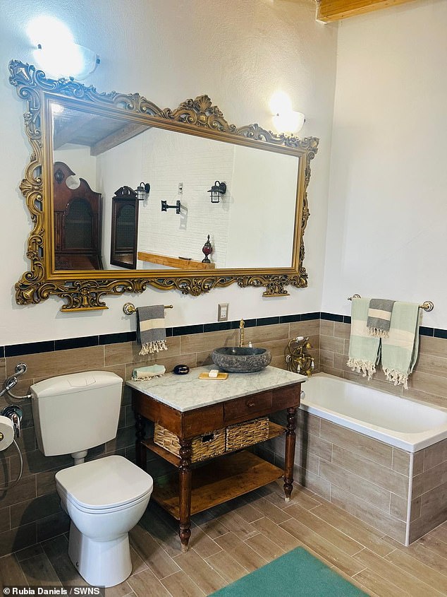 We acquired all the furnishings locally; everything comes from that small town—the kitchen, floors, mirrors, bathtub, and sink.